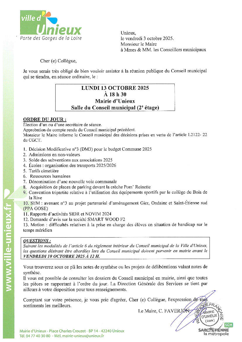 Le prochain Conseil Municipal se tiendra le lundi 13 octobre 2025 à 18h30, au 2e étage de la Mairie.