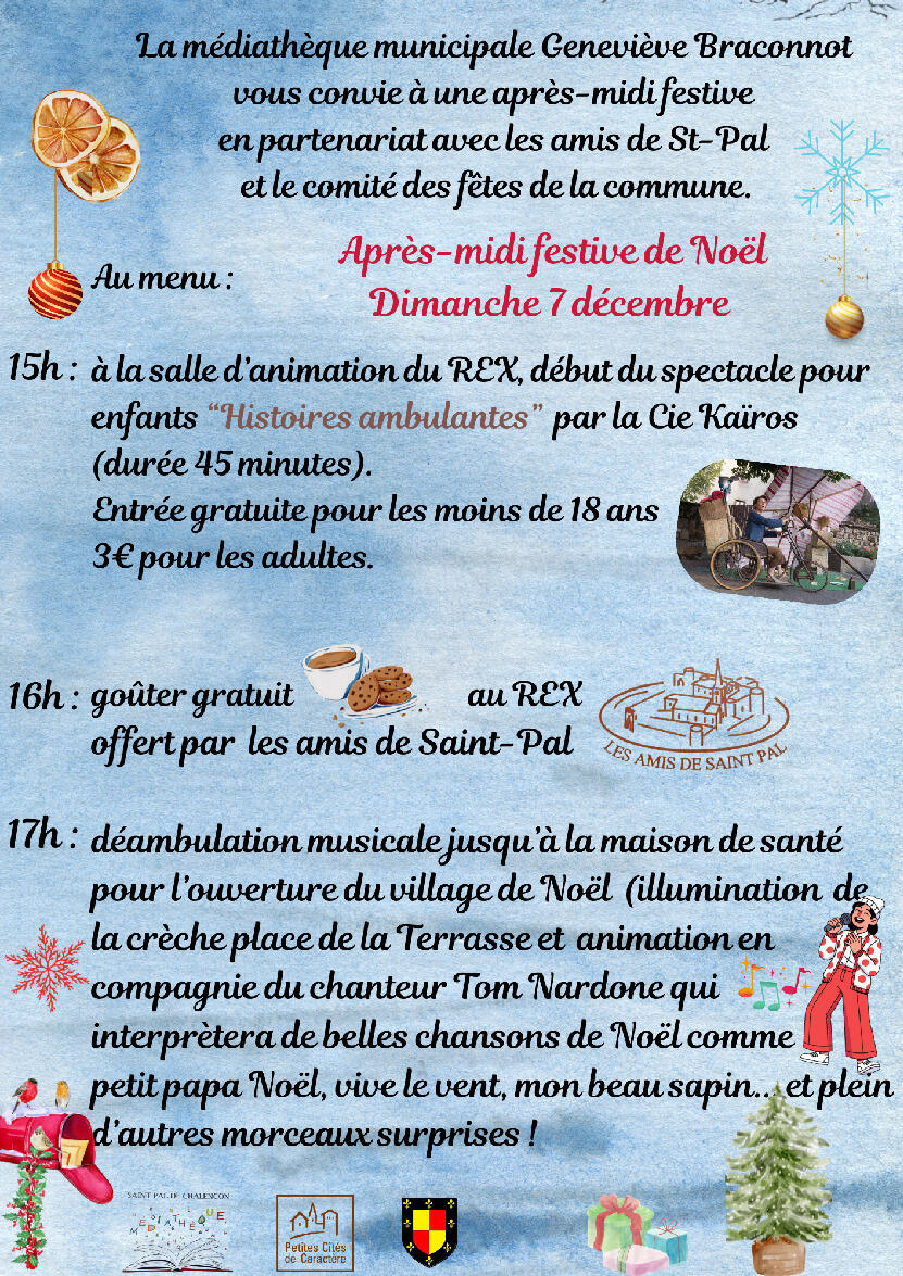 La médiathèque municipale, les amis de St Pal et le Comité des Fêtes de la commune vous invitent à une après-midi festive de Noël, le Dimanche 7 Décembre.
