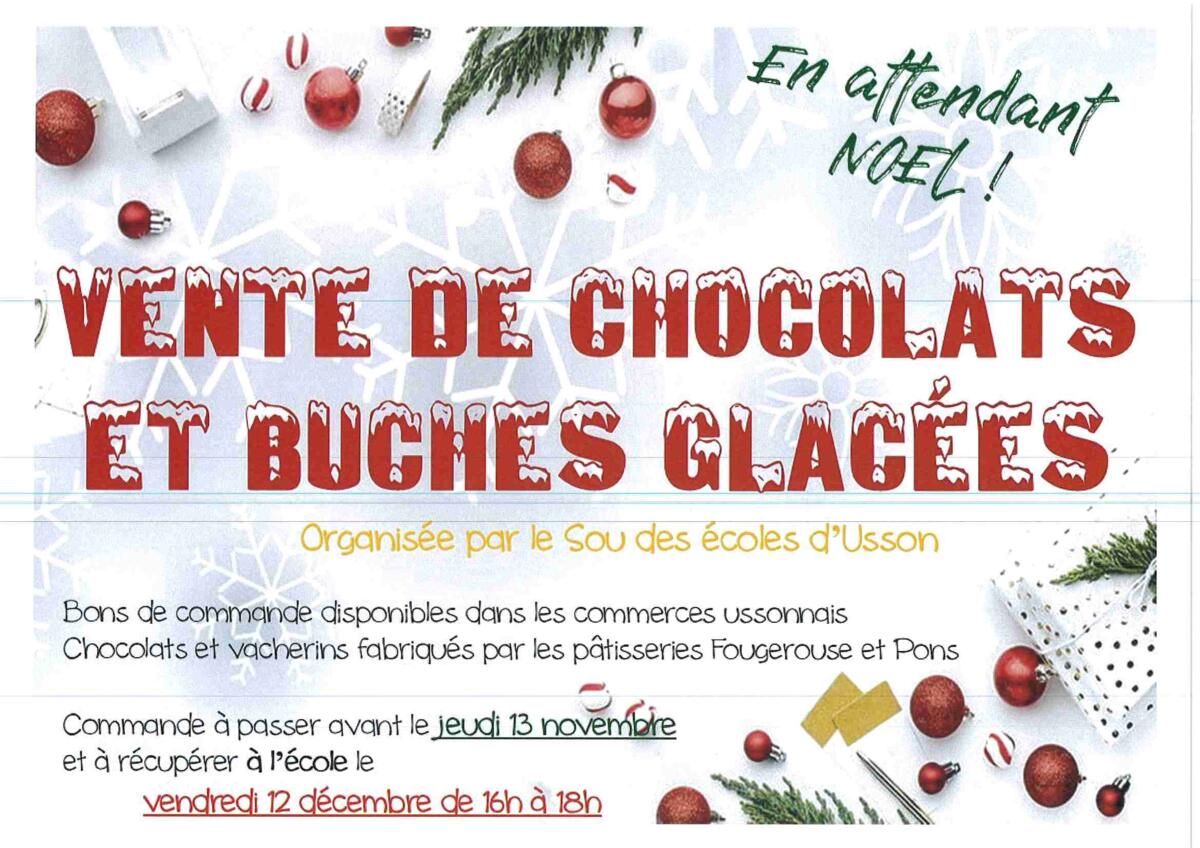 Vente de chocolats et buches glacées 06/11/2025 Vente de chocolats et buches glacées organisée par le Sou des Ecoles d'Usson