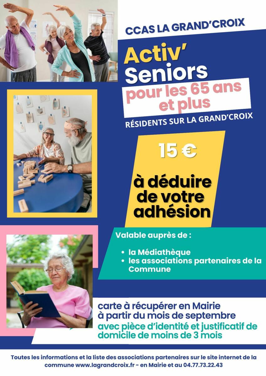 La carte Activ’Séniors est une carte délivrée gratuitement qui permet aux grandcroisiens et grandcroisiennes de 65 ans et plus de profiter d’une réduction de 15 € sur leur adhésion à la Médiathèque ou à une association partenaire de la Commune. (La liste sera bientôt disponible sur le site de la Mairie)