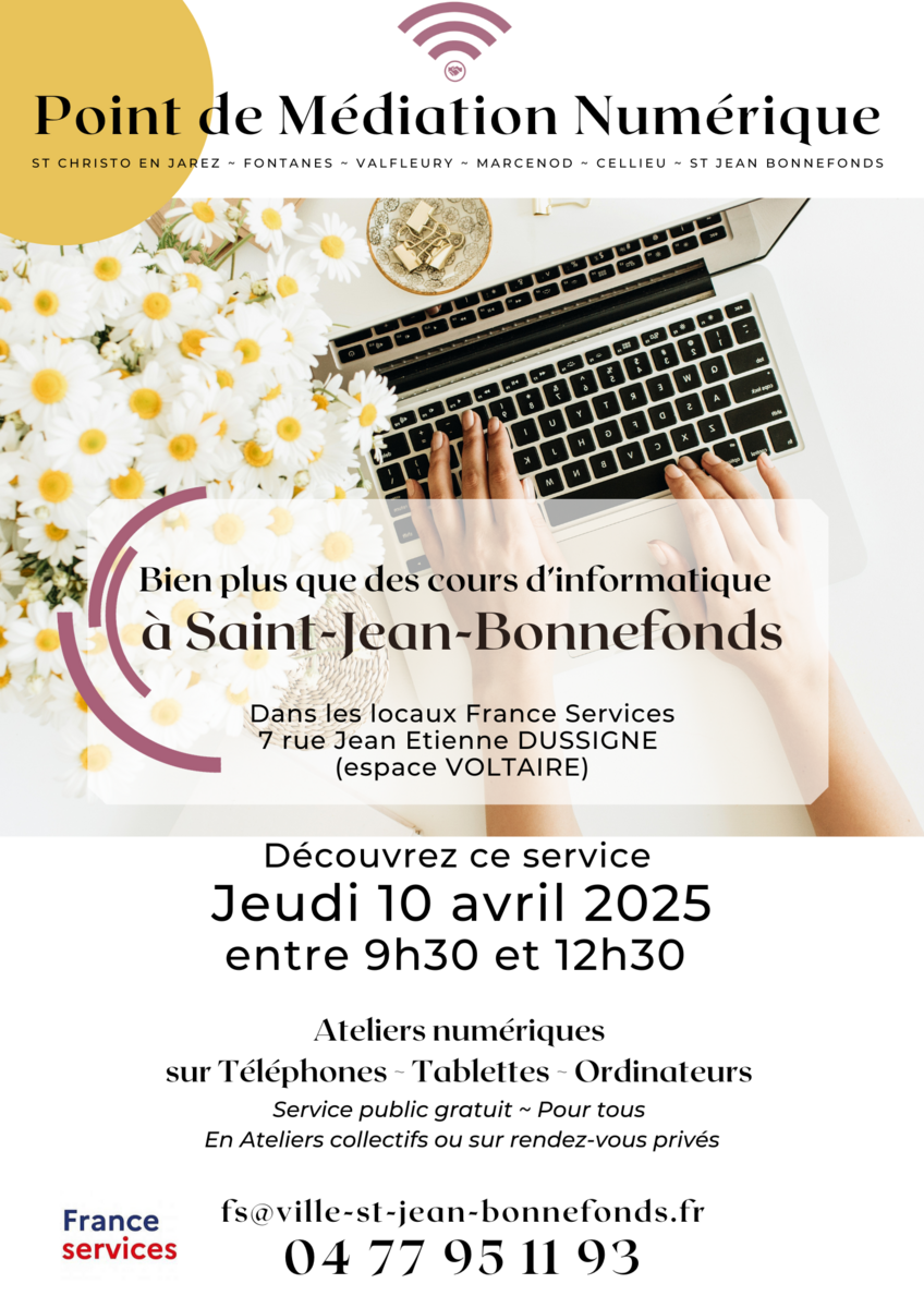 Vous connaissez des habitants de ST JEAN BONNEFONDS qui seraient susceptibles d'avoir besoin d'un petit coup de pouce, autour du numérique? Votre PMN démarrera sur leur commune à partir du JEIUDI 10 AVRIL, tous les jeudis matins : deux heures d'ateliers collectifs, et une heure de rendez-vous privés! Alors parlez-en autour de vous, sans modération!