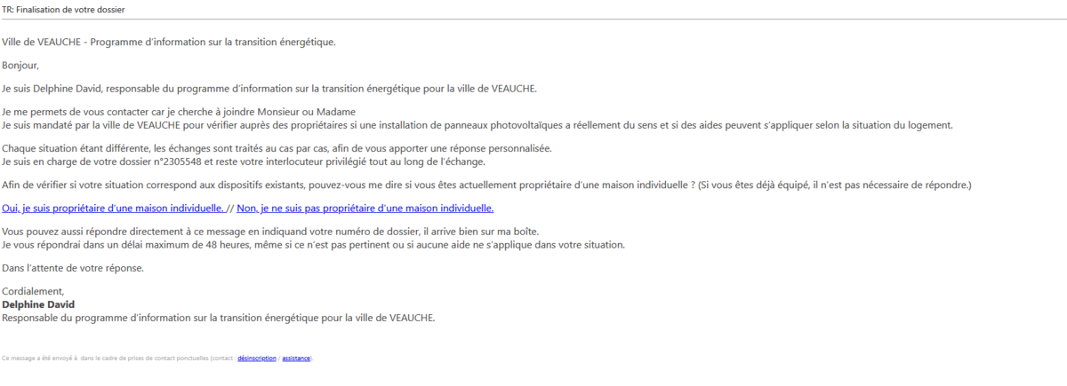 📧 contact@notif.franceservicestravaux.com / signé Delphine David ou Patrick Tessier Responsable du programme d’information sur la transition énergétique pour la ville de VEAUCHE.