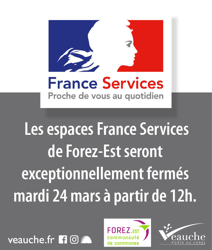 En raison d’une formation obligatoire pour les agents, Les espaces France Services de Forez-Est seront exceptionnellement fermés le mardi 24 mars à partir de 12h.