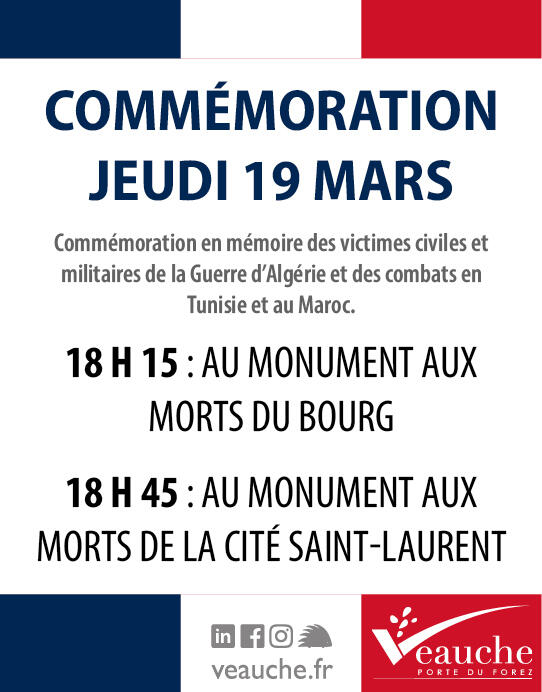 Commémoration en mémoire des victimes civiles et militaires de la Guerre d’Algérie et des combats en Tunisie et au Maroc. jeudi 19 mars à 18 h 15, au monument aux morts du Bourg puis 18 h 45, au monument aux morts de la Cité Saint-Laurent