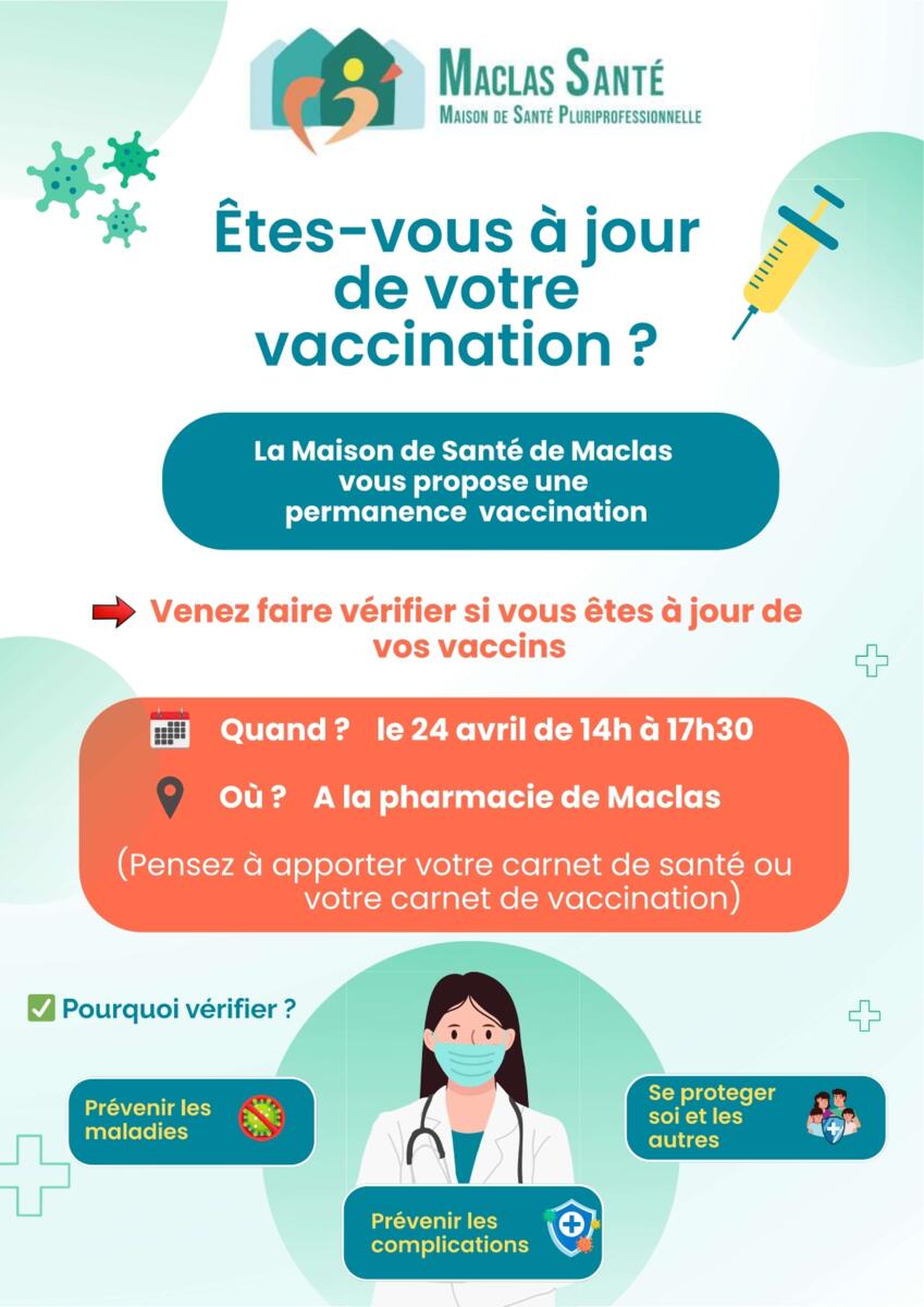 Vaccination 25/03/2026 La MSP de Maclas propose une campagne de vaccination ouverte à tous public le 24 Avril 2026 à la pharmacie de Maclas. Elle sera encadrée par médecins, infirmières et pharmacien.