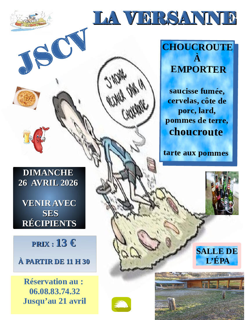 Choucroute À Emporter - Jscv 12/04/2026 L'association JSCV propose une choucroute à emporter le dimanche 26 avril à partir de 11h30, récupérable à l'Espace Plein Air. Réservation jusqu'au 21 avril au 06 08 83 74 32.