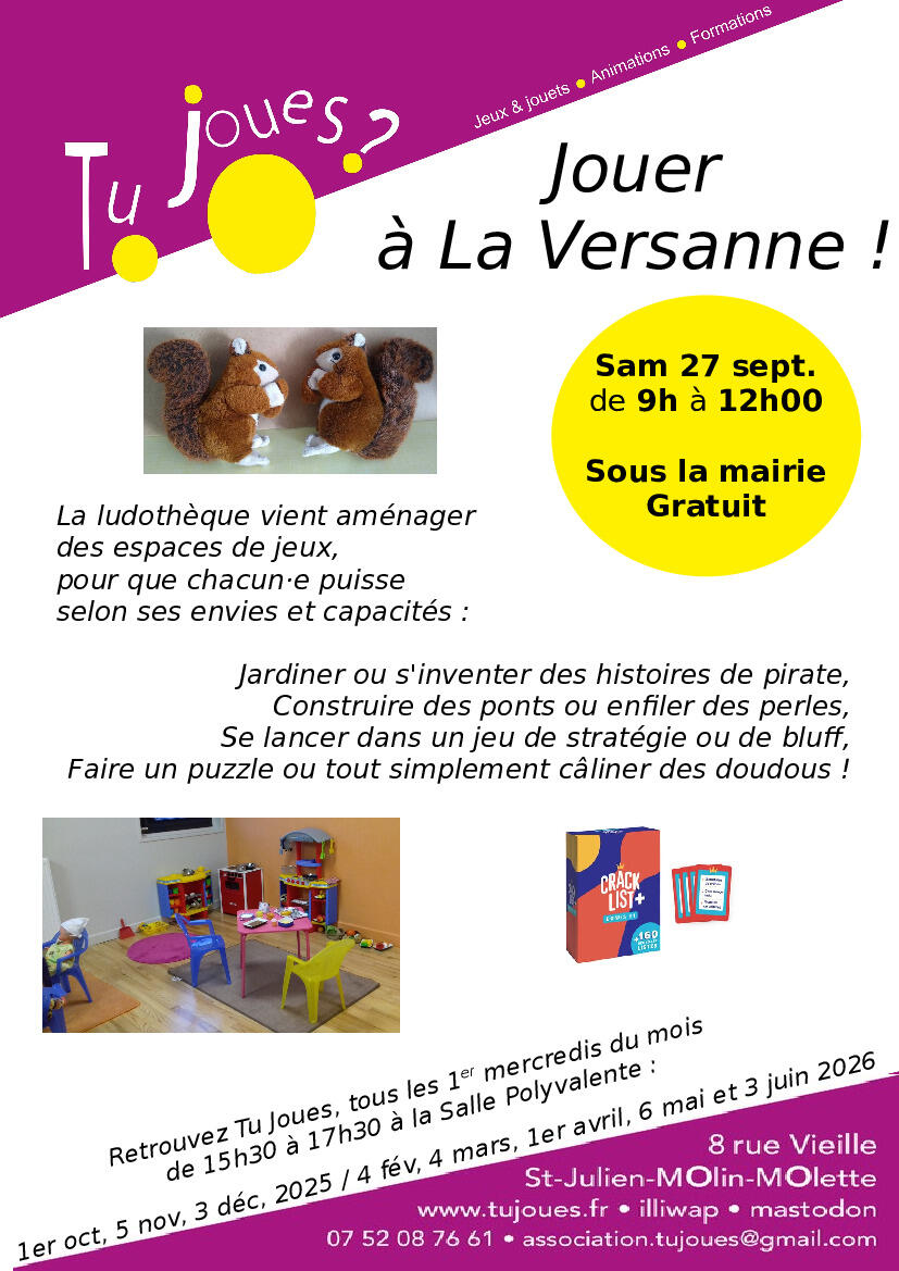 L'association Tu Joues sera présente samedi 27 septembre 2025 de 9H à 12H salle polyvalente (sous la mairie).