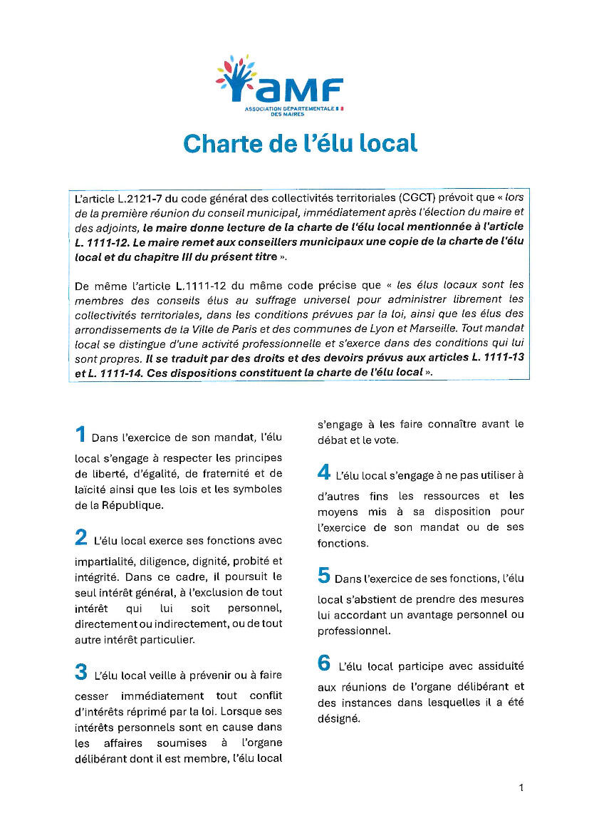 Pour faire suite à l'installation de notre nouveau Conseil Municipal, j'ai le plaisir de partager avec vous la Charte de l'Elu local qui sera notre référence quant aux modalités de notre action durant tout le mandat. ( Il faut double cliquer sur le document pour le lire en entier).