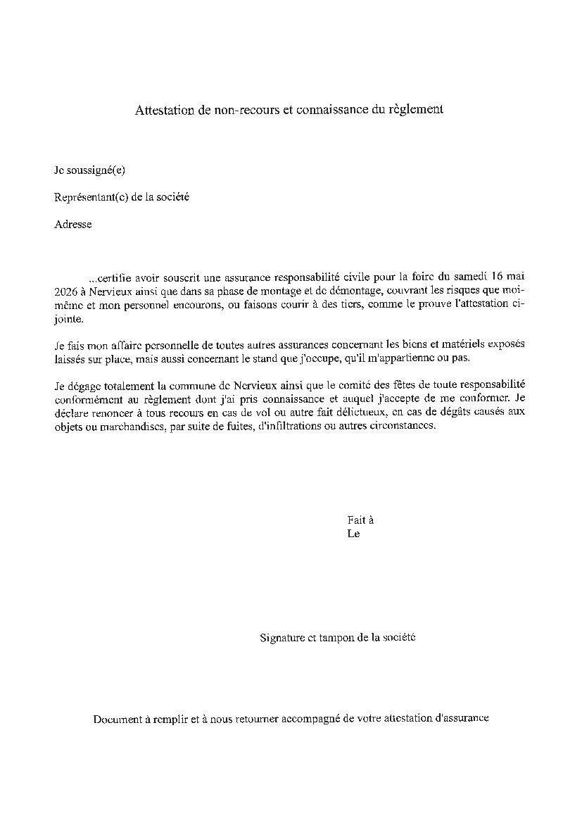 Si vous souhaitez y participer, nous vous prions de bien vouloir trouver ci-dessous les documents relatifs à l'inscription : la fiche d'inscription, l'attestation de non recours, le règlement de la foire, le courrier d'organisation de la foire. L'inscription sera réputée complète à réception de tous les documents dûment demandés et remplis.