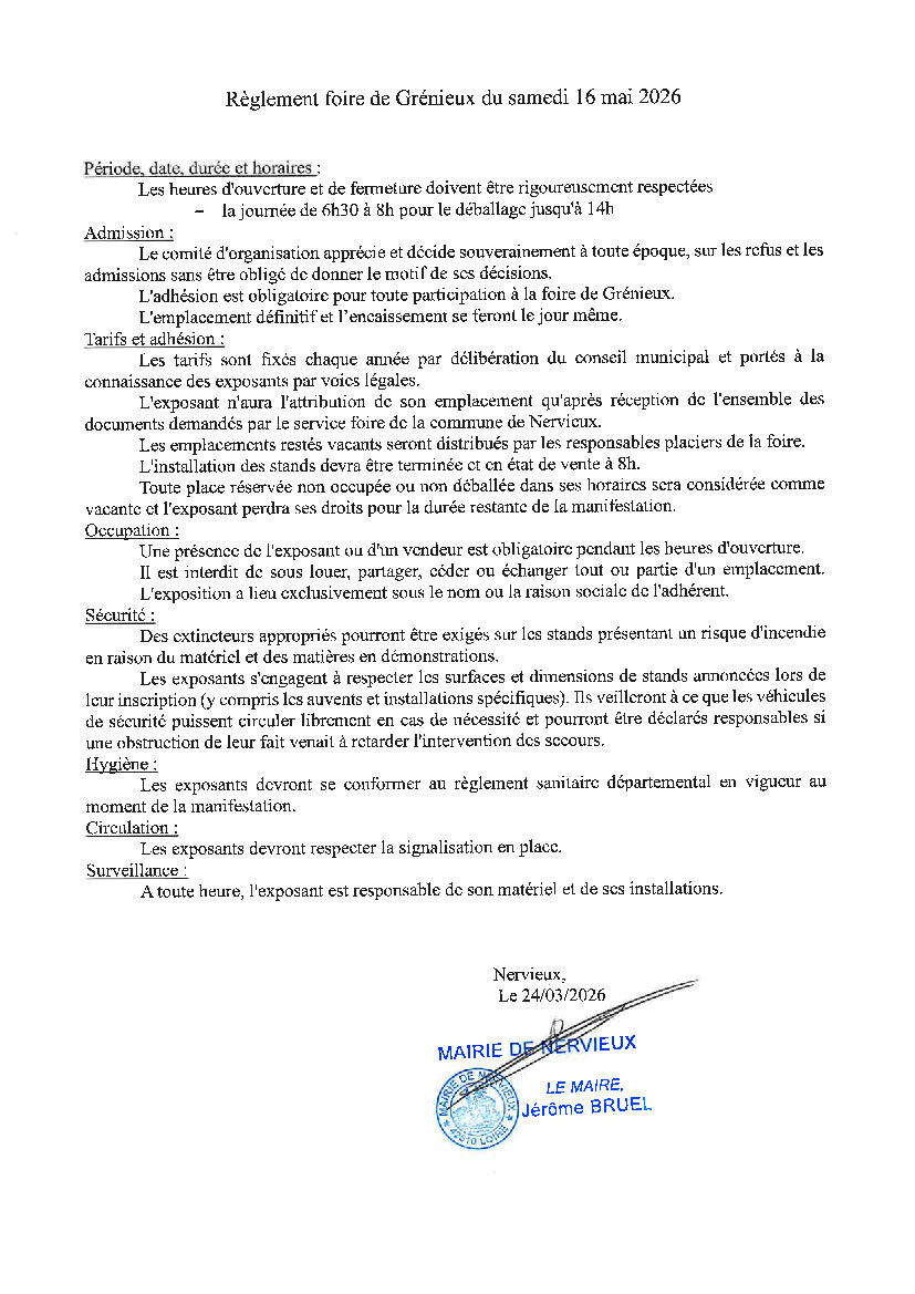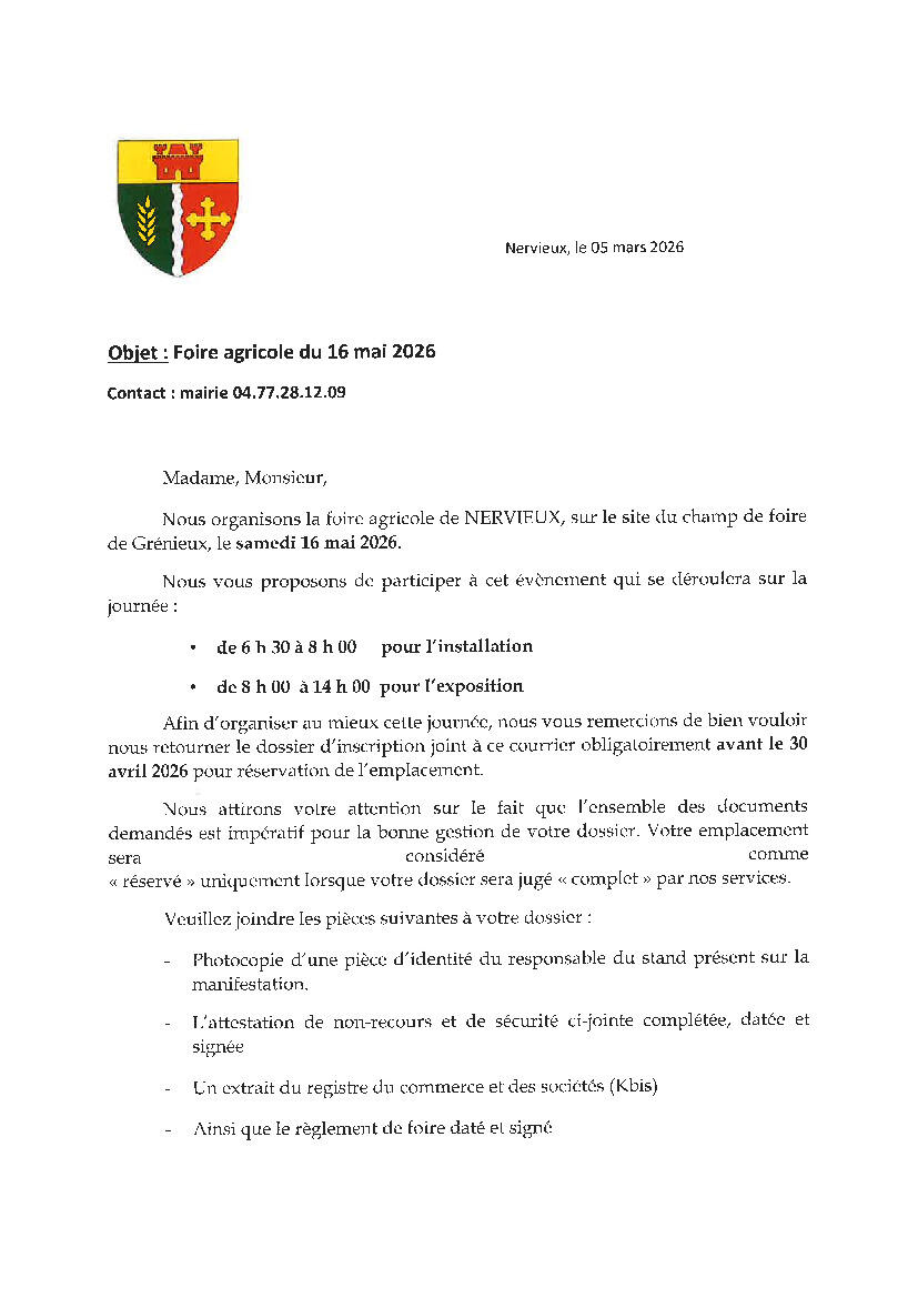 La foire annuelle agricole aura lieu le samedi 16 mai 2026 sur le champ de Foire de Grénieux.