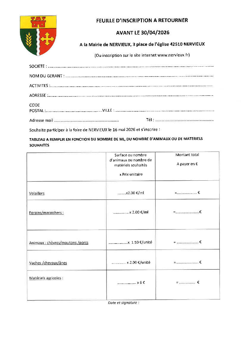 Votre mairie / Actualités / INSCRIPTION FOIRE ANNUELLE AGRICOLE DU 16 MAI