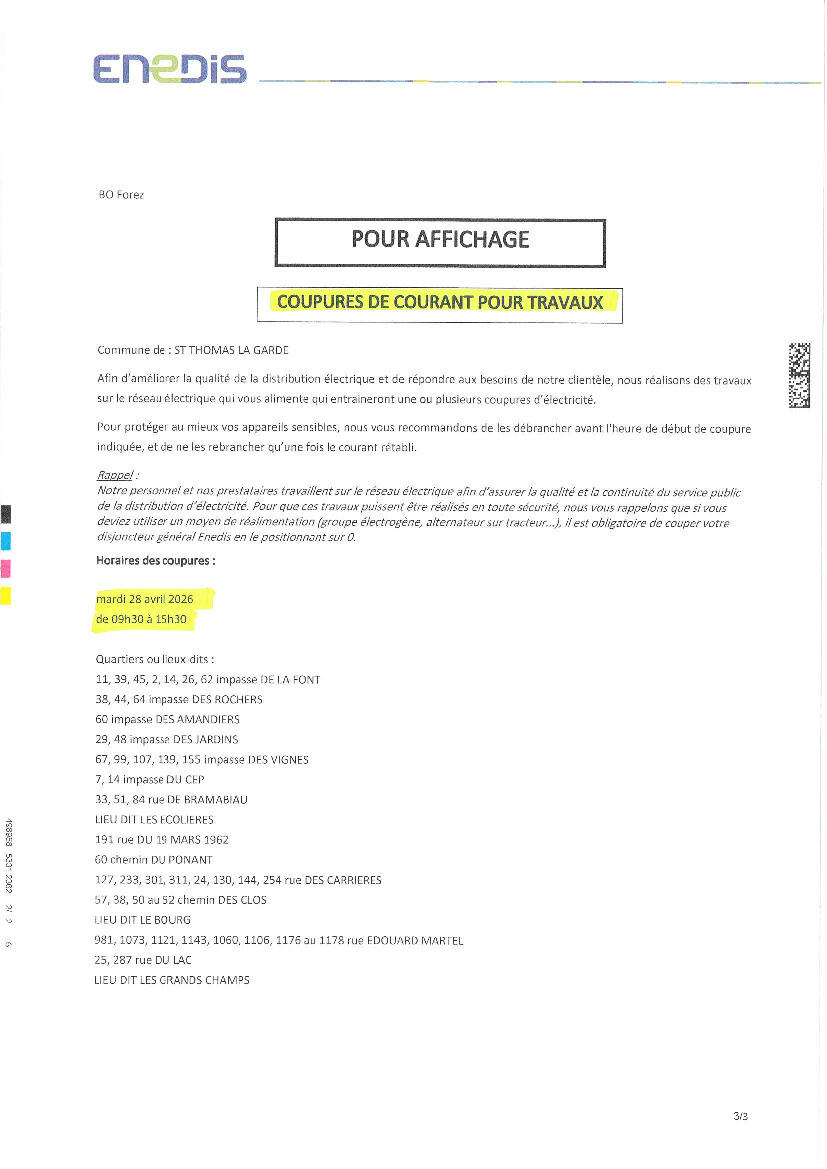 Enedis prévoit des coupures de courant le mardi 28 avril sur la commune aux adresses listées dans le document joint.
