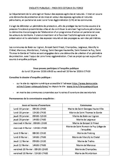 Permanence de la commissaire enquetrice le lundi 19 janvier de 13h30 à 17h30 à St Thomas la Garde
