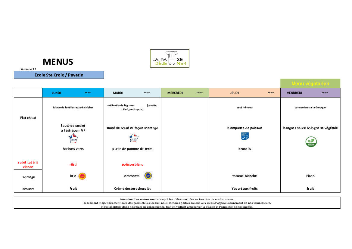 Menus de la Cantine Semaine 17
