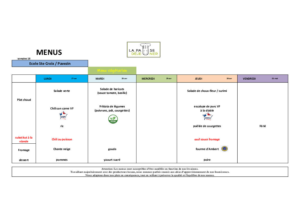 Menus de la Cantine Semaine 18