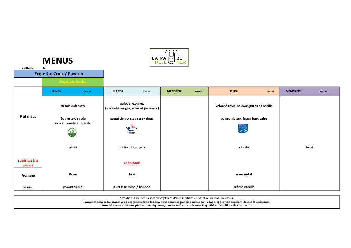 Menus de la Cantine Semaine 19