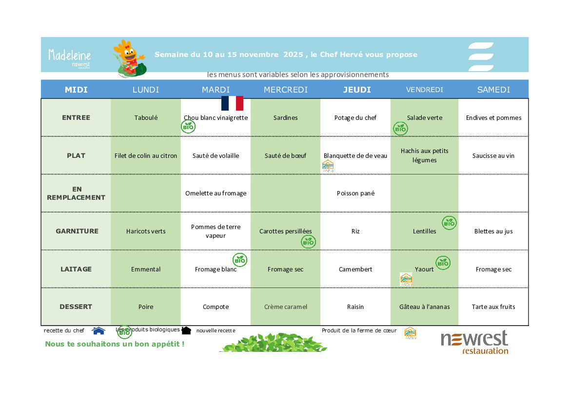 Menus du 10 au 15 novembre 2025
