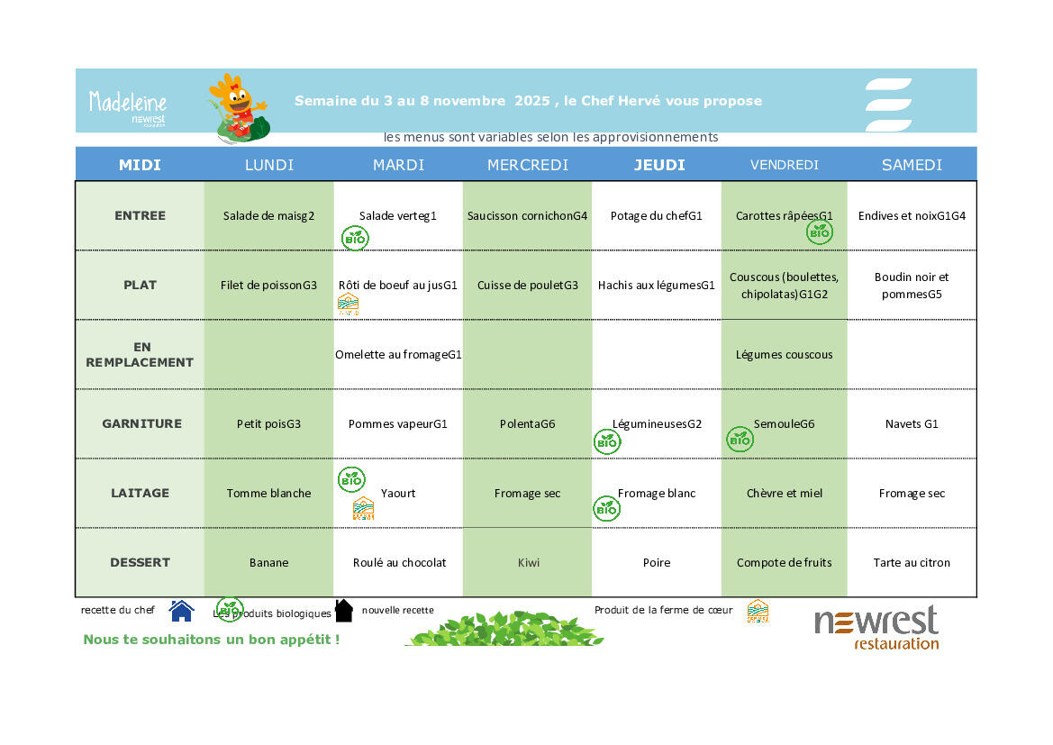 Menus du 3 novembre au 8 novembre 2025