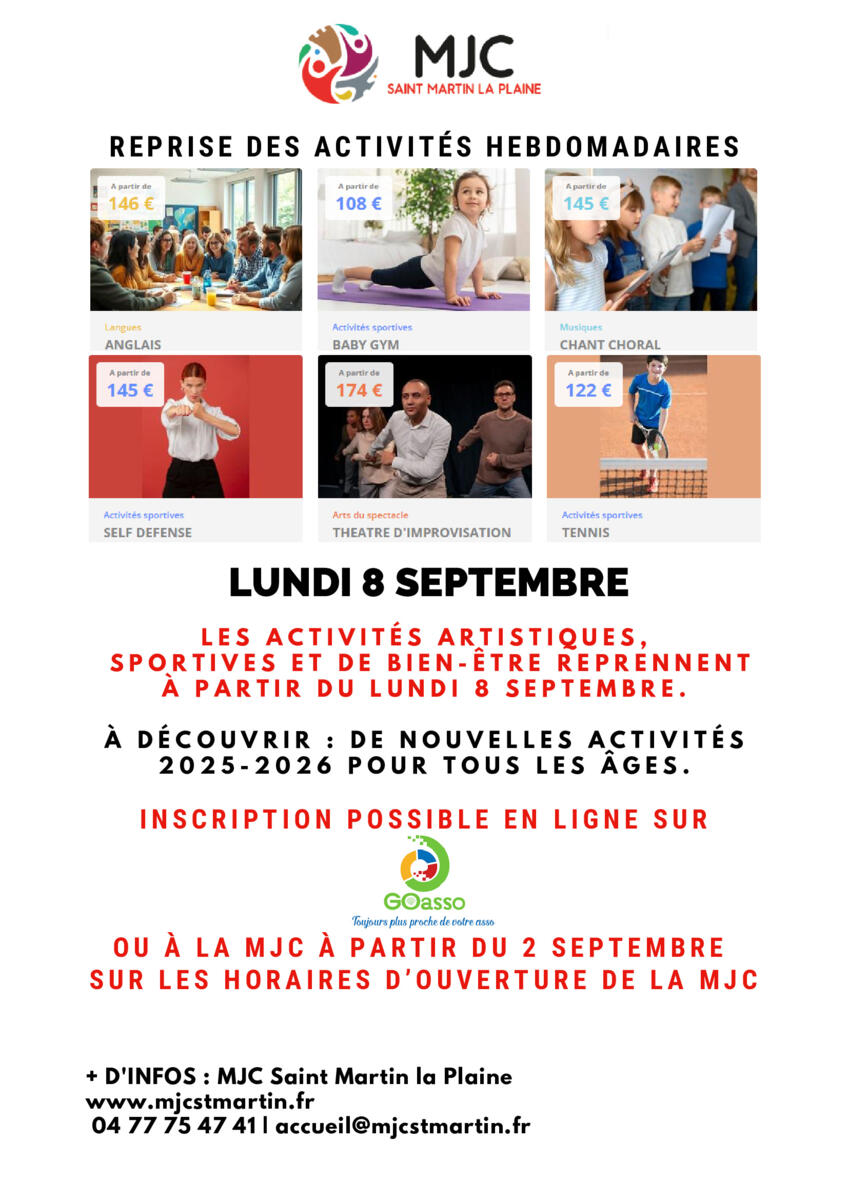 Les activités hebdomadaires de la MJC reprennent à partir du lundi 8 septembre.