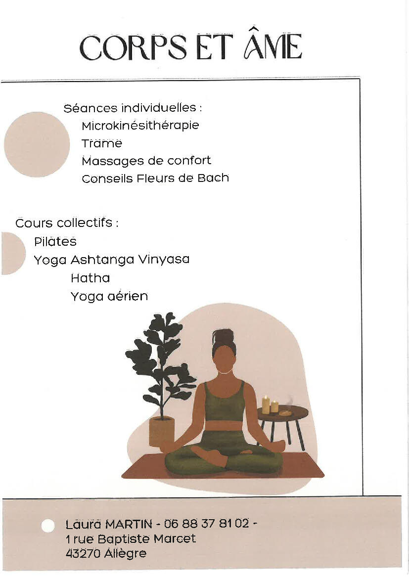 Corps et Âme propose des séances individuelles (microkinésithérapie, trame, massages de confort, Fleurs de Bach) ainsi que des cours collectifs : Pilates, Ashtanga Vinyasa, Hatha et yoga aérien.