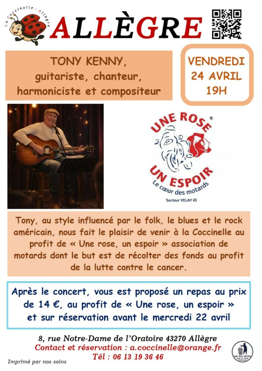 - Concert de Tony KENNY au profit de l'opération "Une rose un espoir" vendredi 24 avril à 19h00. Pour ceux qui le souhaitent, un repas vous est proposé en fin de concert pour 14 € (rôti de porc, gratin, salade et tarte) sur réservation avant mercredi 22 avril.