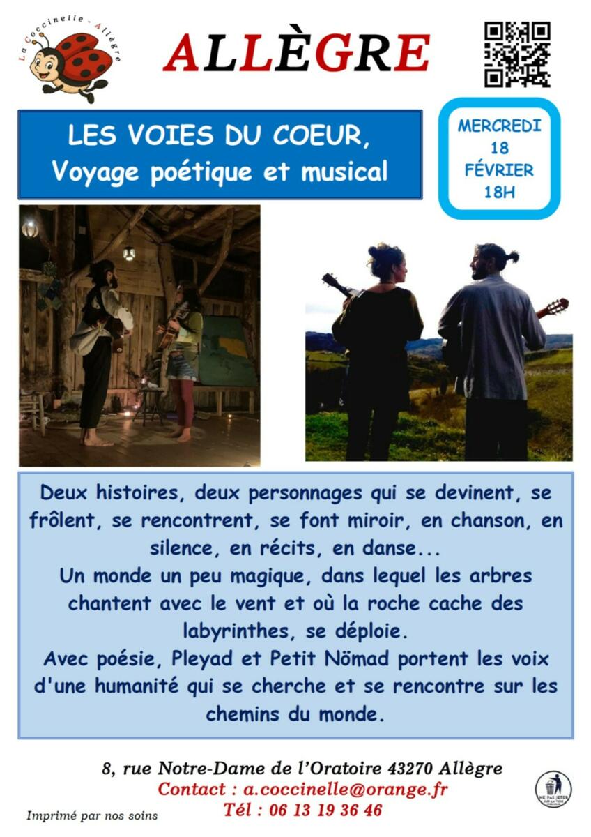 - Voyage poétique et musical Les voies du coeur, mercredi 18 février à 18h00.