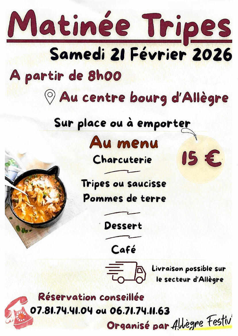 Matinée Tripes – Allègre Rendez‑vous samedi 21 février 2026 dès 8h au centre bourg pour une matinée conviviale, sur place ou à emporter.