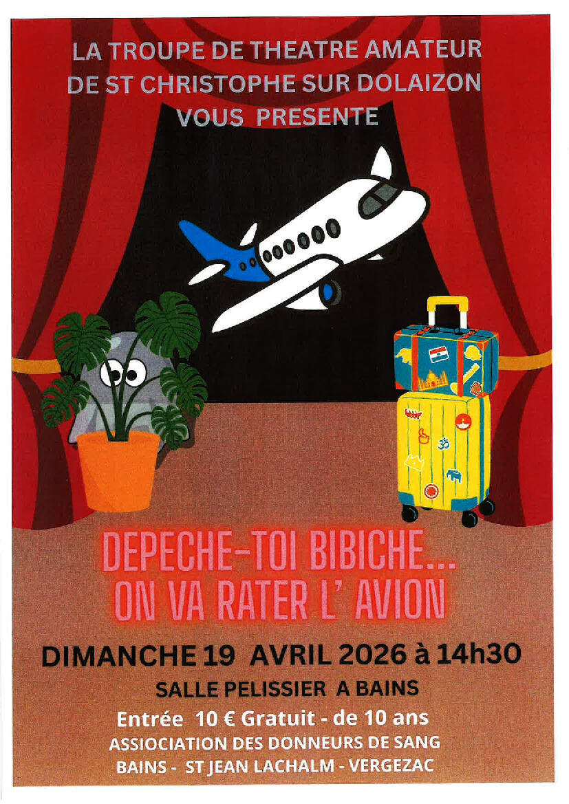 Dimanche 19 Avril, la troupe de théâtre amateur de Saint-Christophe-sur-Dolaizon se produira à la Salle Pélissier à 14 h 30 avec la pièce « Dépêche-toi Bibiche, on va rater l’avion ». En résumé : un couple, Marc et Sophie, prépare un voyage au Maroc mais beaucoup d’aléas surviennent et vont perturber ce départ… et provoquer des changements dans la vie du couple.