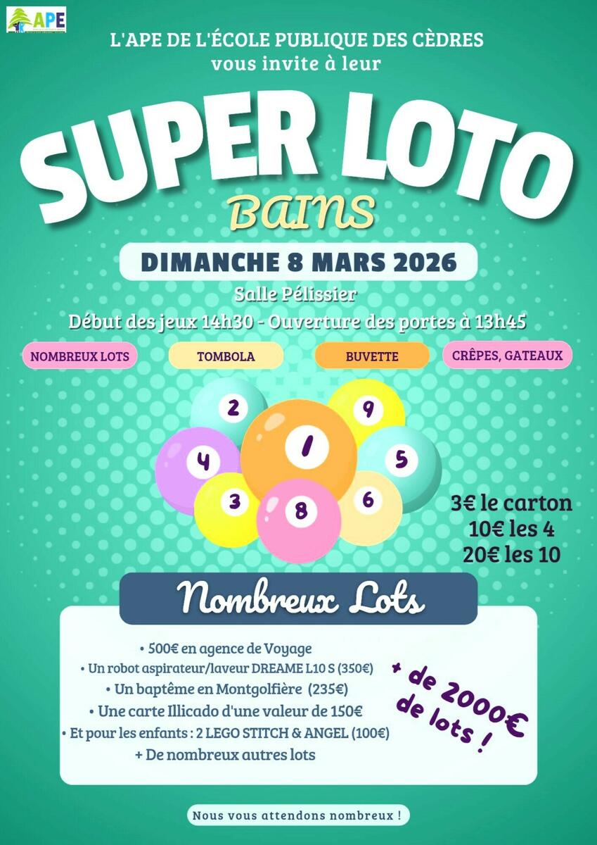 Après le succès du carnaval le 21 février dernier, l’Association des Parents d’Elèves de l’Ecole Publique des Cèdres poursuit sa belle dynamique et vous donne rendez-vous pour son traditionnel loto le dimanche 08 mars à la salle Pélissier.