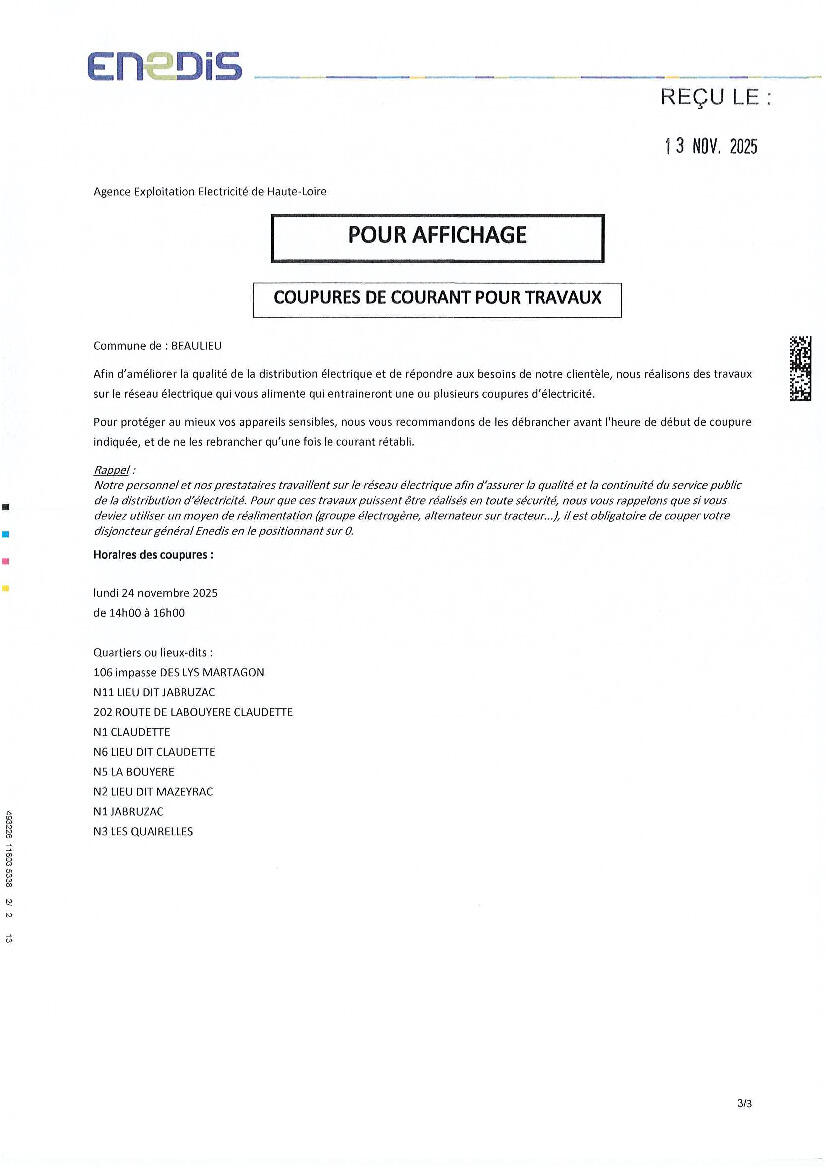 24/11 : Coupure d'électricité (JABRUZAC, LA BOUYERE ... )