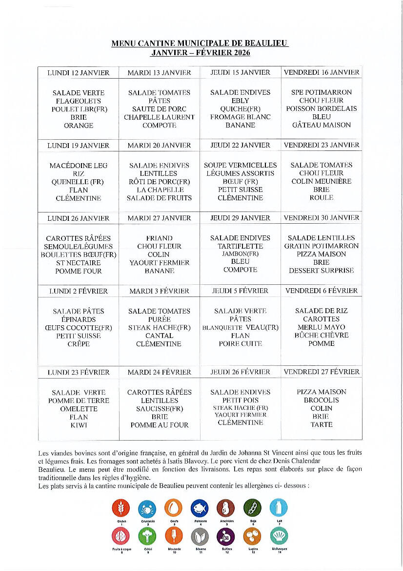 🍽️Menu Cantine Du 12/01 Au 27/02/2026 04/02/2026 Menu cantine du 12/01 au 27/02/2026 (susceptible d'être modifié) Pensez à inscrire vos enfants les jeudis