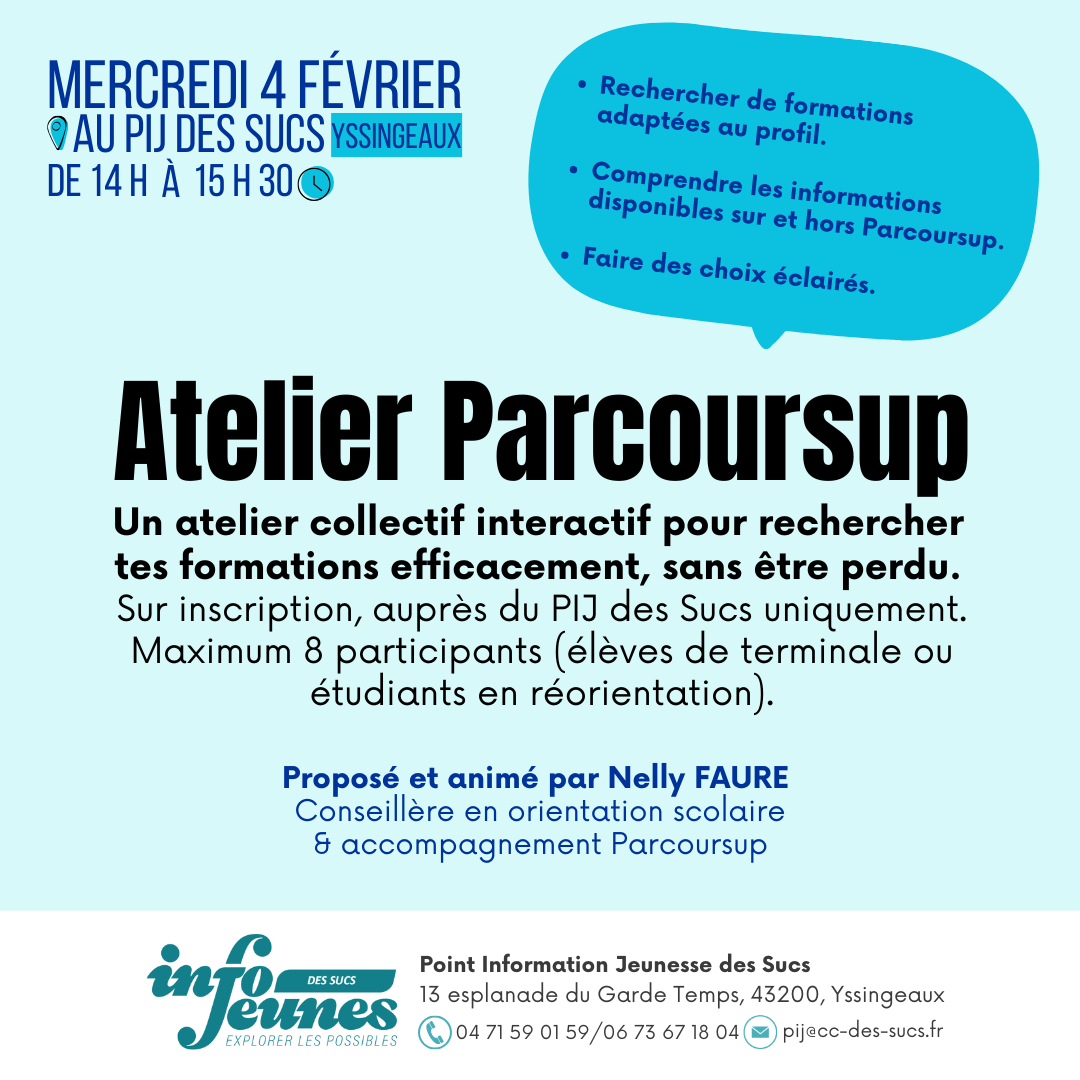 Alors on te donne rendez-vous au PIJ pour un atelier dédié à Parcoursup le mercredi 4 février à 14 heures avec Nelly Faure, conseillère d'orientation.