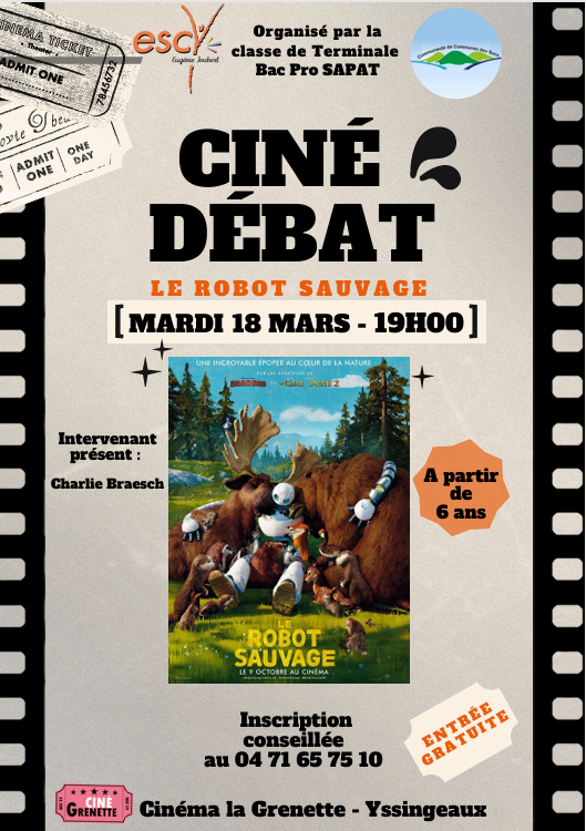 - Mardi 18 mars à 19h30, ciné débat sur le film le Robot Sauvage au cinéma la Grenette à Yssingeaux. Un pot d'accueil sera proposé à partir de 19h.
