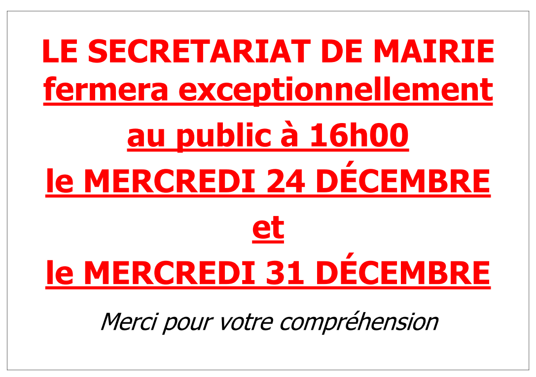 📌 INFORMATION CHANGEMENT HORAIRES DU SECRETARIAT DE MAIRIE