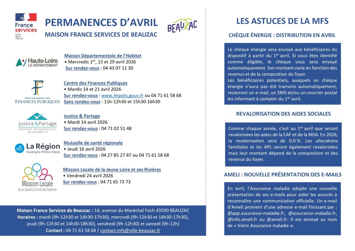 Habitat, impôts, justice, mutuelle de santé, jeunesse... Retrouvez les permanences d'avril à la Maison France Services de Beauzac.