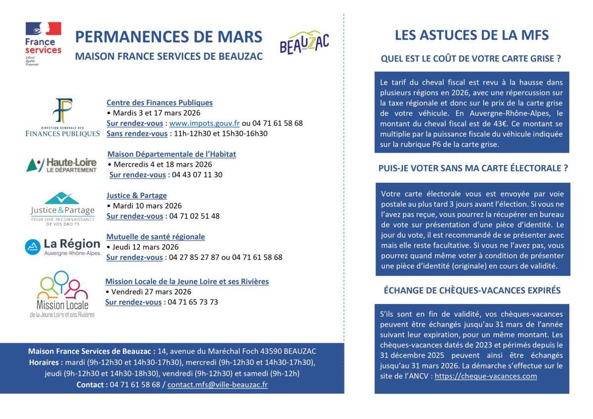 Impôts, habitat, justice, mutuelle de santé, jeunesse... Retrouvez les permanences de mars à la Maison France Services de Beauzac.