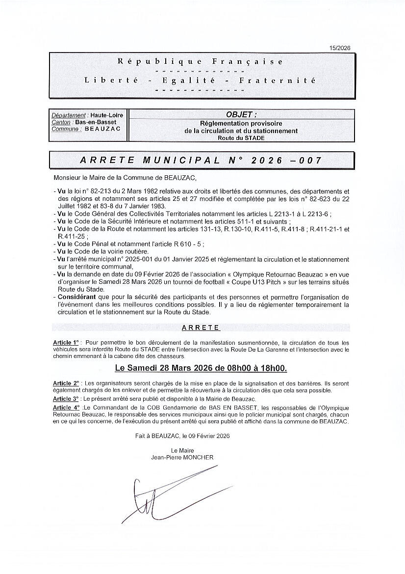 ⚠ REGLEMENTATION PROVISOIRE ROUTE DU STADE
