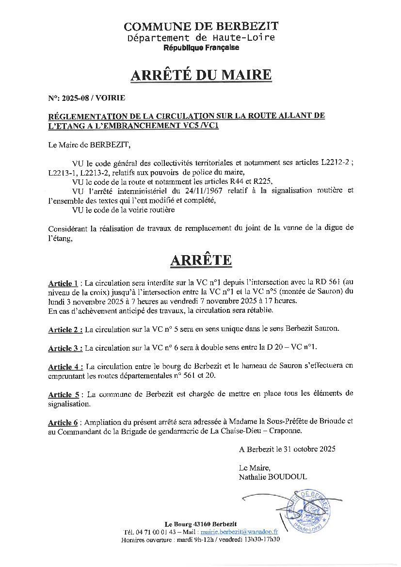 ARRETE REGLEMENTANT LA CIRCULATION TRAVAUX ETANG