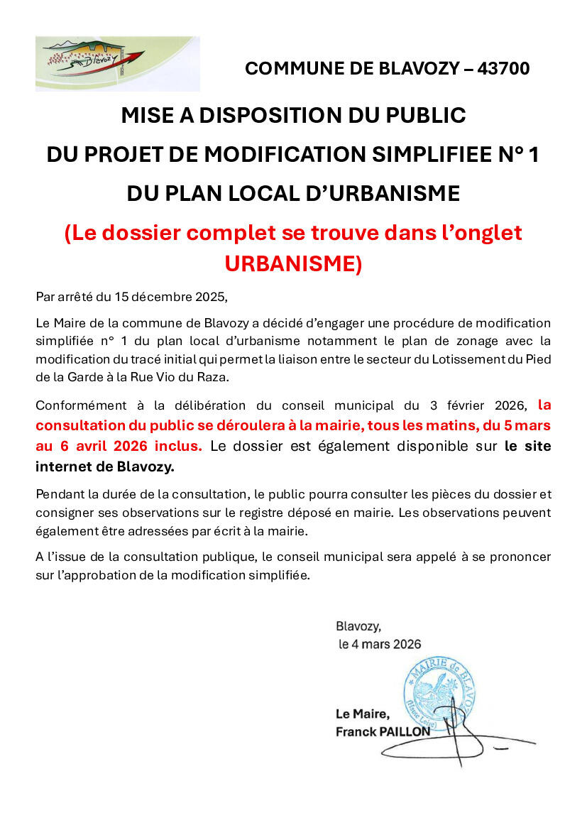 Projet modification PLU consultable à partir du 5 mars