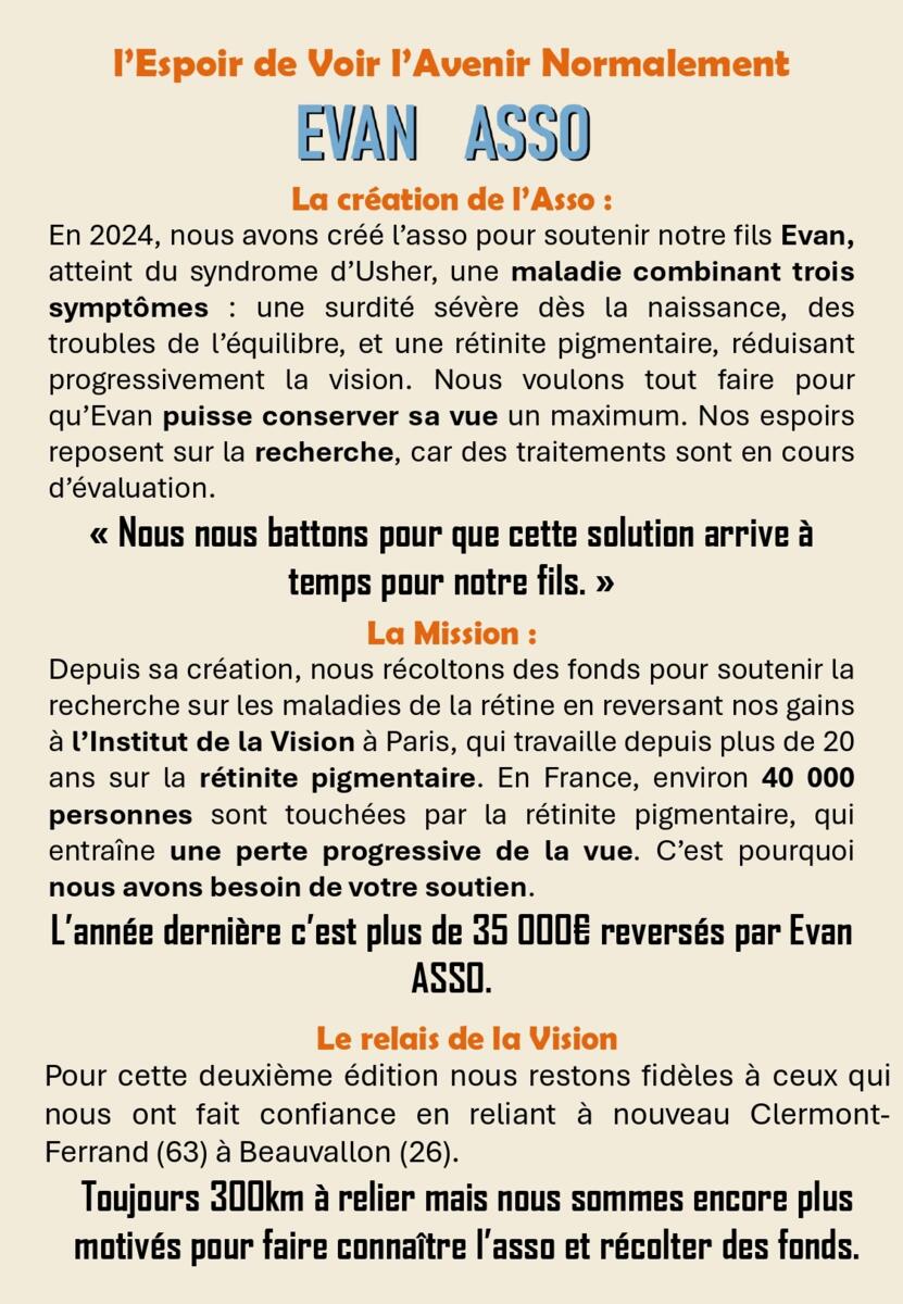 Dans le cadre d’un défi sportif solidaire, nous traversons 300 km entre Clermont-Ferrand et Beauvallon.Vous trouverez ci-dessous le lien vers notre site, indiquant les horaires de passage. Si certaines personnes souhaitent nous accompagner et partager quelques kilomètres avec nous, elles seront les bienvenues avec grand plaisir. https://evan-asso.org/le-relais-de-la-vision...