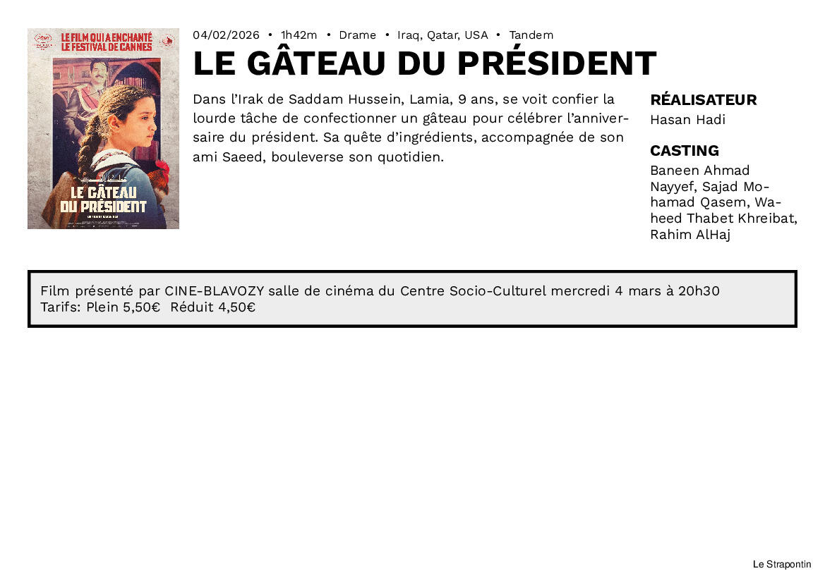 à 20h30: Le gâteau du Président (drame) 1h50 avec: Baneem Ahmad Nayyef, Sajad Mahamad Quasem