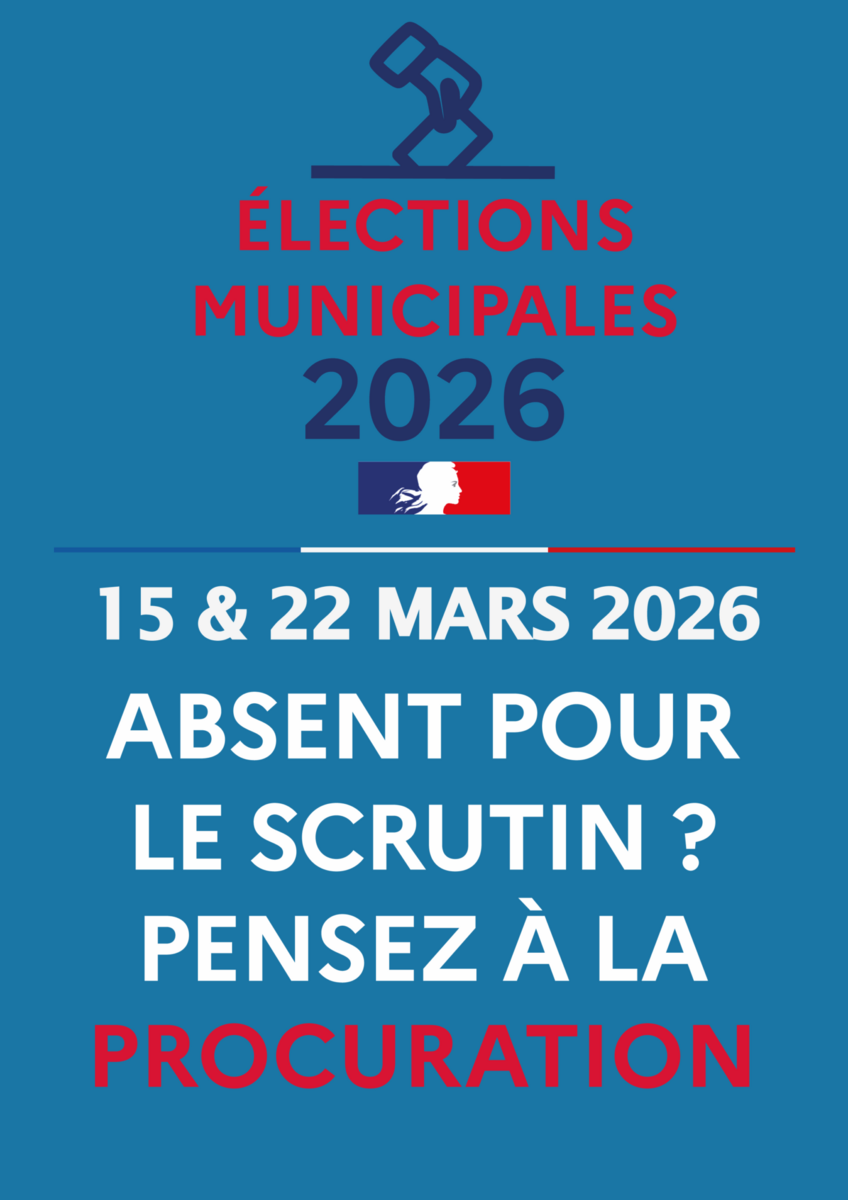 Absent Pour Les Élections ? Pensez À La Procuration ! 06/03/2026 Absent le jour des élections municipales du 15 mars ? Pensez à donner procuration. Vous pouvez le faire à tout moment et jusqu'à un jour avant le scrutin.
