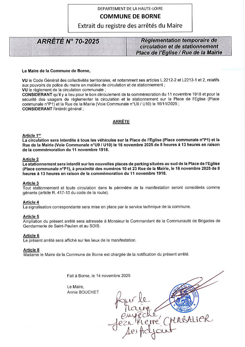 Ainsi, la circulation sera interdite à tous les véhicules sur la Place de l’Église et la Rue de la Mairie (entre les deux blocs de boites aux lettres) le dimanche 16 novembre 2025 durant la commémoration.