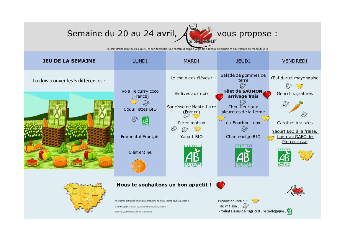 Vous trouverez ci-joint le menu de la semaine du 27 avril au 1er mai 2026.