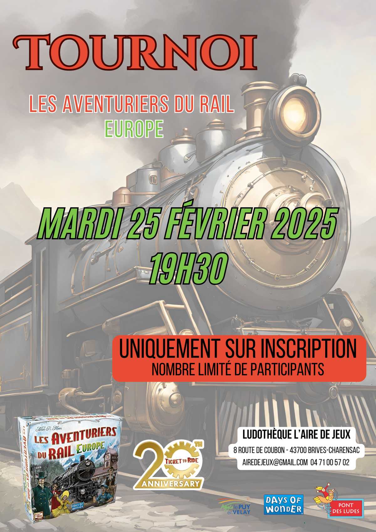 ▶ Mardi 25 février, rendre-vous à la Ludothèque Lud'Agglo (route de Coubon) pour un tournoi du célèbre jeu "Les aventuriers du Rail Europe", à 19h30 !