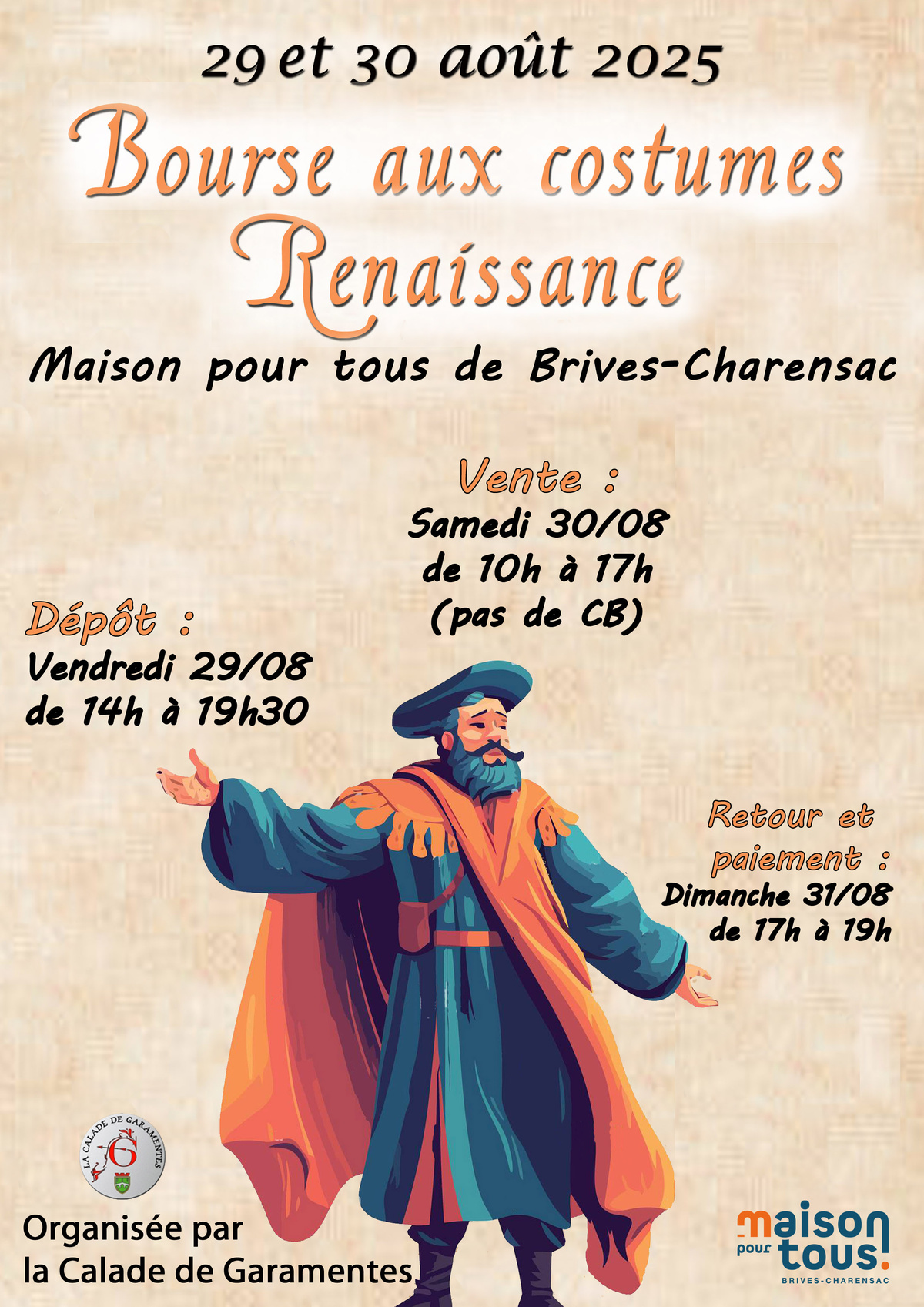 👍 La Calade de Garamentes organise une bourse aux costumes Renaissance, dans la salle des spectacles de la Maison Pour Tous de Brives-Charensac.
