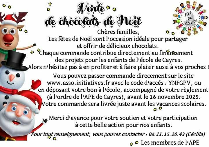 🍫🎅 VENTE CHOCOLATS DE NOEL POUR L'ECOLE DE CAYRES 🤶 🍬