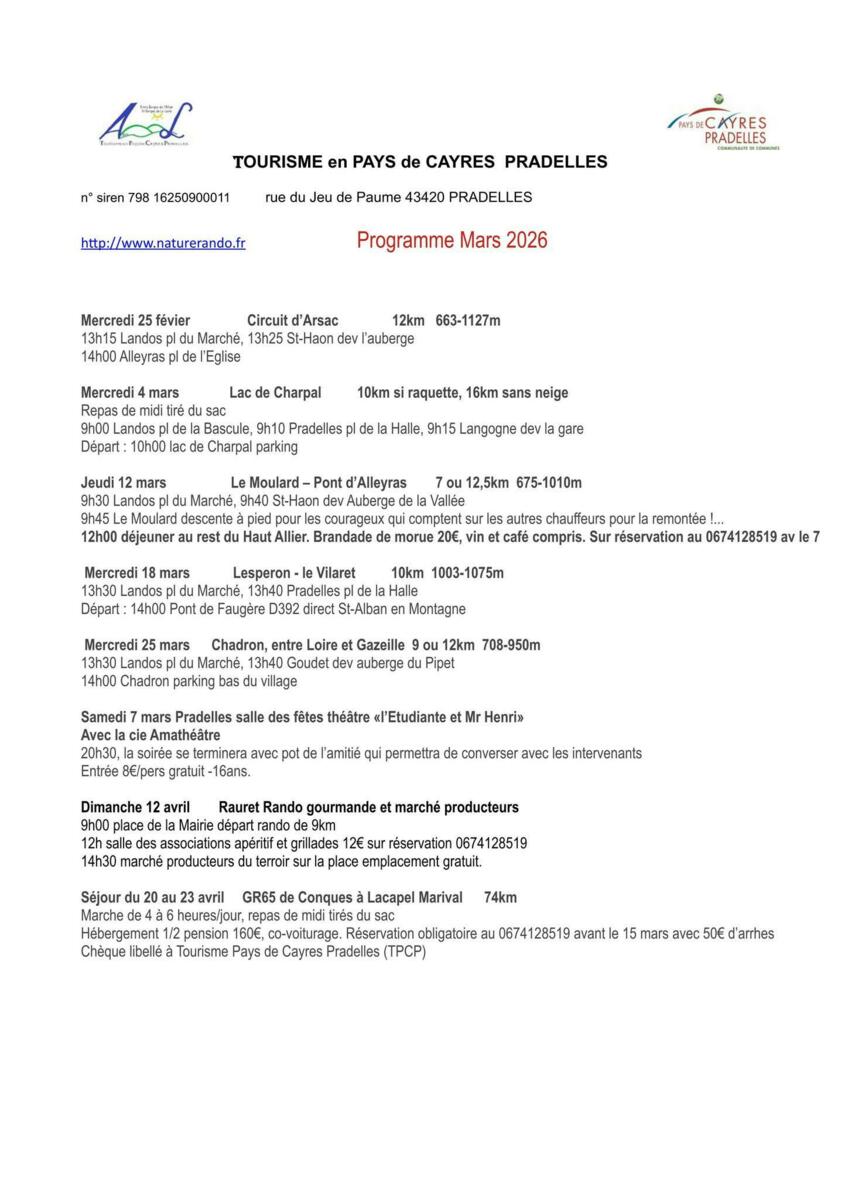 PROGRAMME RANDONNEES CAYRES PRADELLES - MARS 2026