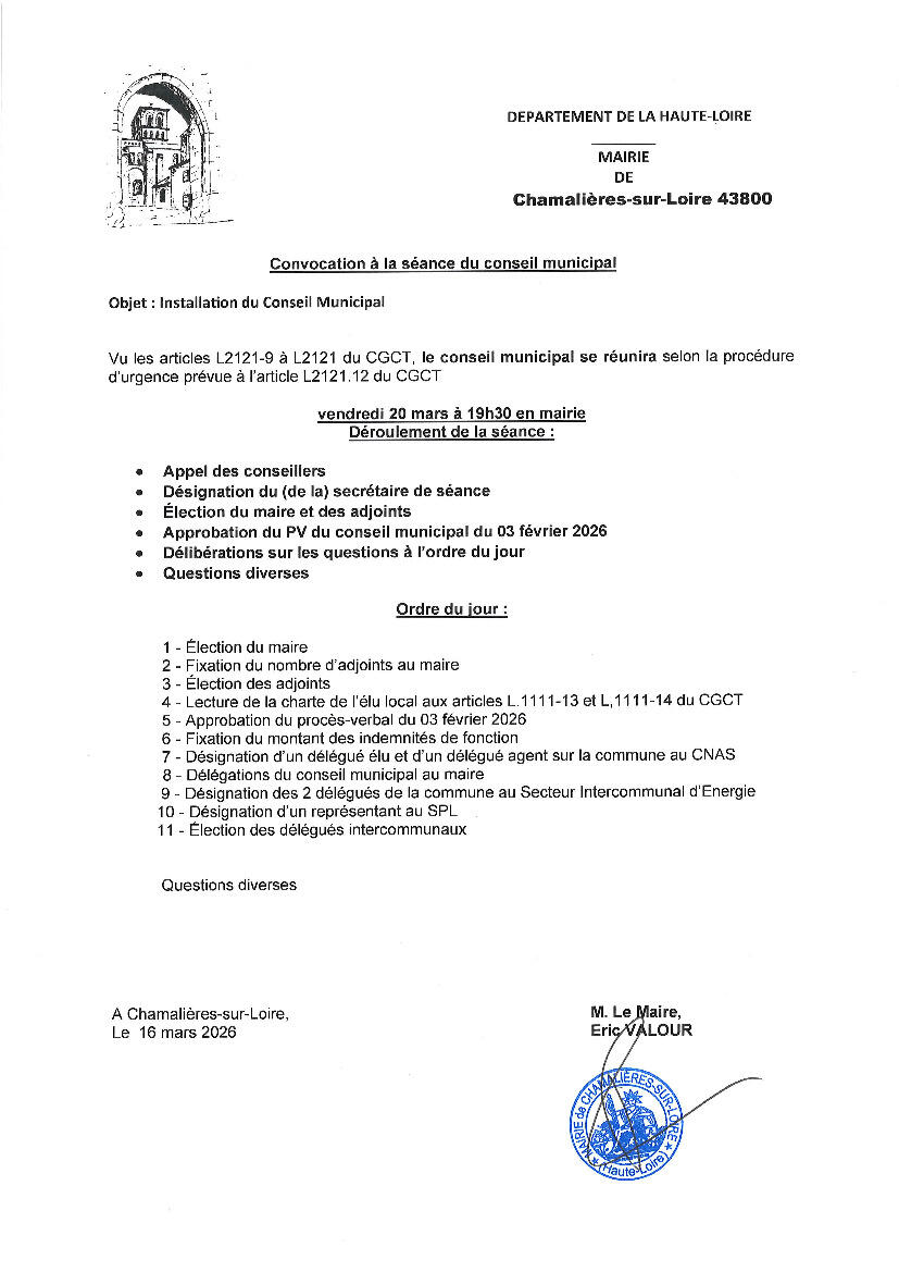 Le prochain conseil municipal se déroulera le vendredi 20 mars à 19H30. A cette occasion, et notamment, seront élus le maire et ses adjoints. Veuillez trouver ci-joint l'ordre du jour correspondant.