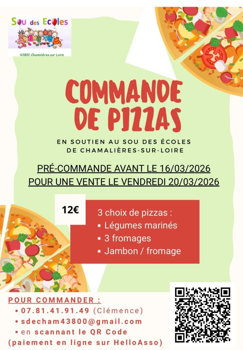 L'association du Sou des Écoles organise, en partenariat avec la boulangerie de Chamalières-sur-Loire, une vente de pizzas afin de financer des activités pour les enfants de l'école publique. A cette occasion, elle tient à remercier la boulangerie Granjean pour son soutien ! Les commandes sont à passer avant le lundi 16 mars. La LIVRAISON aura lieu le vendredi 20 mars à l'école publique de 16h30 à 18h. Vous trouverez toutes les informations utiles sur l'affiche jointe. Soutenons nos associations !